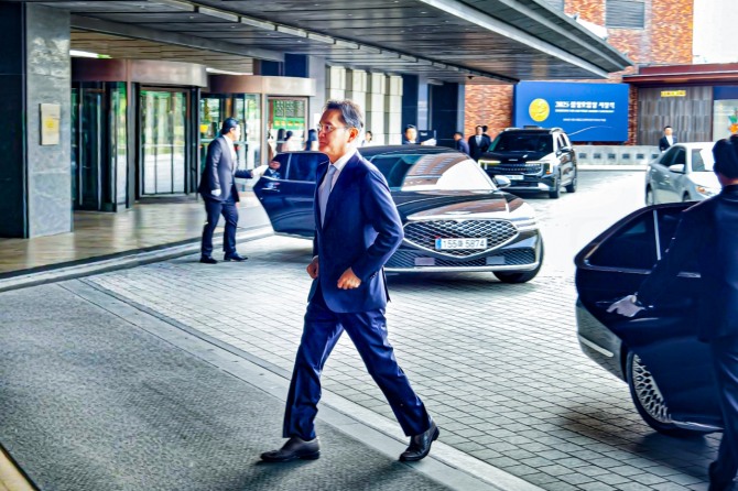이재용 삼성전자 회장이 30일 오후 서울 중구 신라호텔에서 열린 2025 삼성호암상 시상식에 참석하기 위해 신라호텔 행사장으로 이동하고 있다.