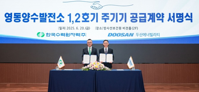 두산에너빌리티는 한국수력원자력과 3300억원 규모의 ‘영동양수발전소 1∙2호기 주기기 공급 계약’을 체결했다고 20일 밝혔다. 계약식은 서울 중구 한수원 방사선보건원에서 열렸다.