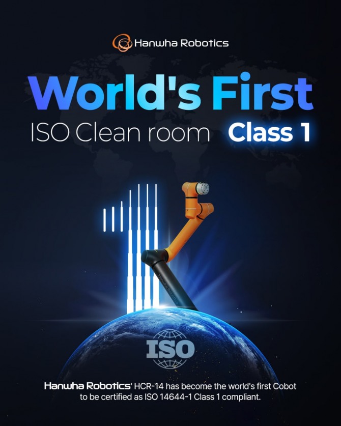 클린룸 관련 국제 표준인 ‘ISO 14644-1’은 공기 부피 당 입자 수를 기준으로 청정도를 클래스1~9로 분류한다. 한화로보틱스가 받은 등급인 클래스1은 공기 1㎥ 당 지름 0.1㎛ 크기의 오염 입자 10개 이하만 허용되는 가장 엄격한 청정도 등급이다. 클래스1 인증을 받은 협동로봇은 작동 중 오염 물질이 거의 발생하지 않는다.