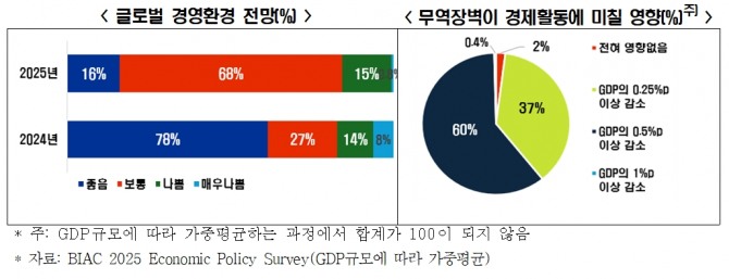 아울러 조사 참여 경제단체의 97%는 높아진 무역 장벽이 자국 국내총생산(GDP)에 부정적인 영향을 미칠 것으로 예상했다. 최근 미국 트럼프 행정부발 관세 정책과 무역협정 재검토 가능성 등으로 국제 통상질서의 불확실성이 확대되고 보호무역주의가 확산한 데 따른 것으로 분석된다.