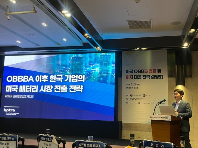이미지 확대보기한국배터리산업협회가 21일 서울 양재 엘타워에서 개최한 '미국 하나의 크고 아름다운 법률(OBBBA)·비자 대응 전략 설명회'에 참석한 배터리·태양광 등 관련 업계 관계자 150여 명은 OBBBA 제정에 따른 미국 투자기업과 협력기업의 투자·생산·공급망 대응 전략·기회 요인 활용 방안을 모색했다. 앞서 트럼프 미국 대통령은 지난 4일 2025년 예산 조정 법안인 OBBBA에 서명한 바 있다.