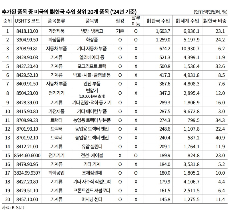 한국무역협회는 “이번에 추가된 관세 품목에 대한 미국의 대(對)한국 수입이 약 118.9억 달러에 이른다”면서 “이번 발표처럼 미국 업계가 파생관세 부과를 요청할 경우 철강·알루미늄 함량이나 수입 증가 여부와 관계없이 수용될 것으로 우려된다”고 분석했다.