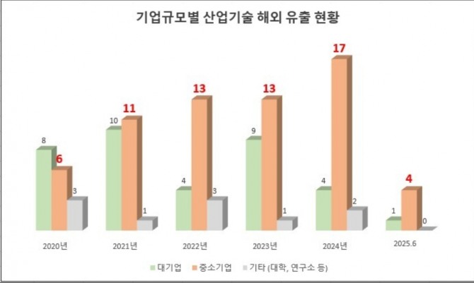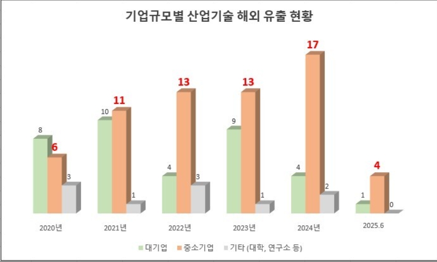 국회 산업통상자원중소벤처기업위원회 소속 김종민 의원이 산업통상자원부에서 제출받은 자료에 따르면, 2020년부터 2025년 상반기까지 확인된 해외 산업기술 유출 110건 중 64건(58%)이 중소기업에서 발생한 것으로 나타났다. 국가핵심기술 유출 피해도 중소기업이 12건(36%)으로 적지 않은 비중을 차지했으며, 특히 2024년에는 대기업의 피해는 없었지만 중소기업에서만 4건이 발생해 우려를 키웠다.