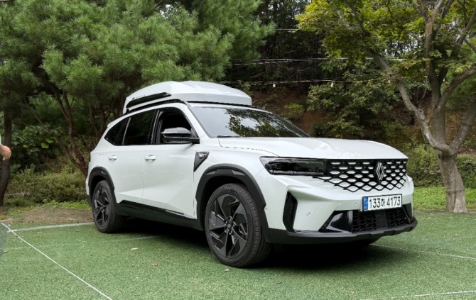 시승 행사에 함께 포함된 그랑 콜레오스 에스카파드(Escapade) 모델은 캠핑과 아웃도어 레저를 즐기는 소비자를 겨냥한 특별판이다. 이름부터 ‘일탈’이나 ‘모험’을 뜻하는 에스카파드는 기본 모델 대비 디자인과 기능 곳곳에 색다른 포인트가 더해졌다. 외관에서 가장 눈에 띄는 것은 큼직한 전용 루프박스다. 에스카파드는 두 가지 버전으로 나오는데, 하나는 우리가 시승한 차량처럼 파노라마 선루프가 적용된 선루프 버전이고 다른 하나는 선루프 대신 일체형 루프박스가 장착된 루프박스 버전이다.