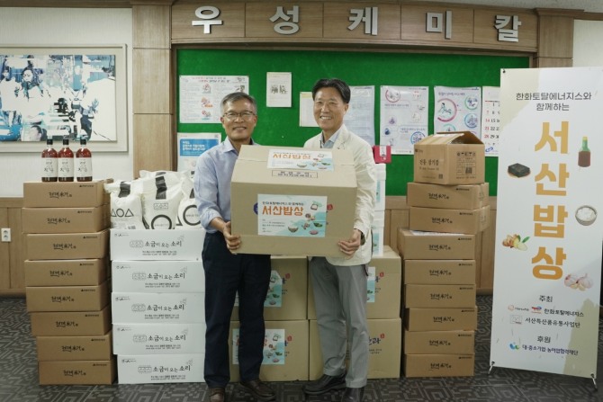 이미지 확대보기한화토탈에너지스는 서산 지역 농수산물로 구성된 ‘서산밥상 데이’ 행사를 열고, 수지 제품 고객사인 우성케미칼(경북 영천)을 방문해 서산 지역 농수산물을 전달했다고 25일 밝혔다.