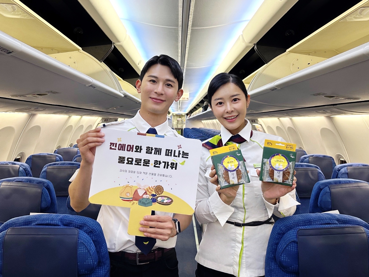 먼저 추석 연휴가 시작되는 5일 김포공항 국내선 탑승구에서는 일부 항공편 탑승객을 대상으로 특별한 선물을 전달한다. 이날 LJ659편(김포~포항), LJ651편(김포~사천), LJ505편(김포~제주), LJ655편(김포~울산) 탑승객에게는 전통 명절 간식인 약과 등을 증정한다. 진에어의 기내 유상 판매 서비스 ‘지니홈배송’에 입점한 브랜드 ‘야다’와의 협업을 통해 화장품 샘플이 추가로 제공된다.