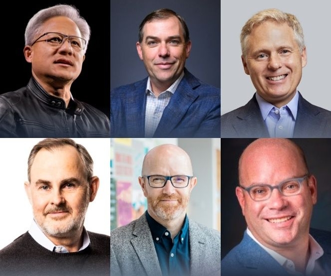 (윗쪽 왼쪽부터)젠슨 황 엔비디아 창업자 겸 CEO, 맷 가먼 아마존웹서비스(AWS) CEO, 사이먼 칸 구글 마케팅 부문 부사장, 안토니 쿡 마이크로소프트(MS) 기업 부사장, 사이먼 밀러 메타 부사장, 에릭 에벤스타인 틱톡 공공정책 총괄. 사진=뉴시스