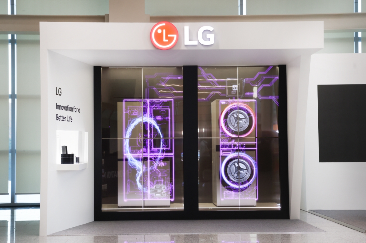 투명 올레드 사이니지 뒤에 워시타워와 냉장고 제품을 배치하고 투명한 화면 위에서 실제 제품과 영상을 매칭해 냉장고의 ‘인버터 리니어 컴프레서’, 워시타워의 ‘AI DD모터’ 등에 적용된 차별화된 AI 코어테크를 보여준다.