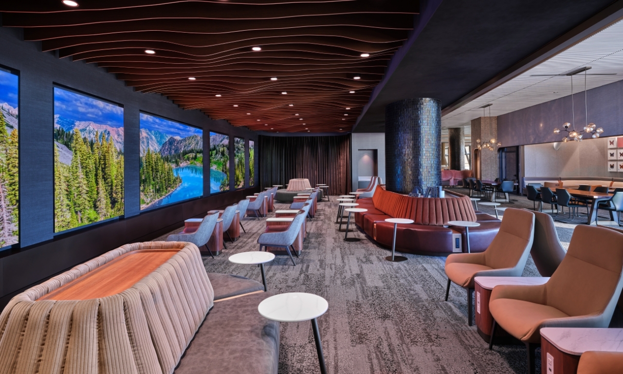 이미지 확대보기라운지의 디자인은 유타주의 장엄한 자연미를 세련되고 현대적인 감각으로 재해석했다. 입구의 기하학적 천장 구조와 매끄러운 모자이크 바닥은 겨울 햇살이 눈 위에서 반짝이는 모습을 떠올리게 하며 위층 공간 전반에 사용된 목재와 보석빛 장식, 구리 디테일은 산, 호수, 동굴 등 유타의 지형적 특징을 상징적으로 표현했다.