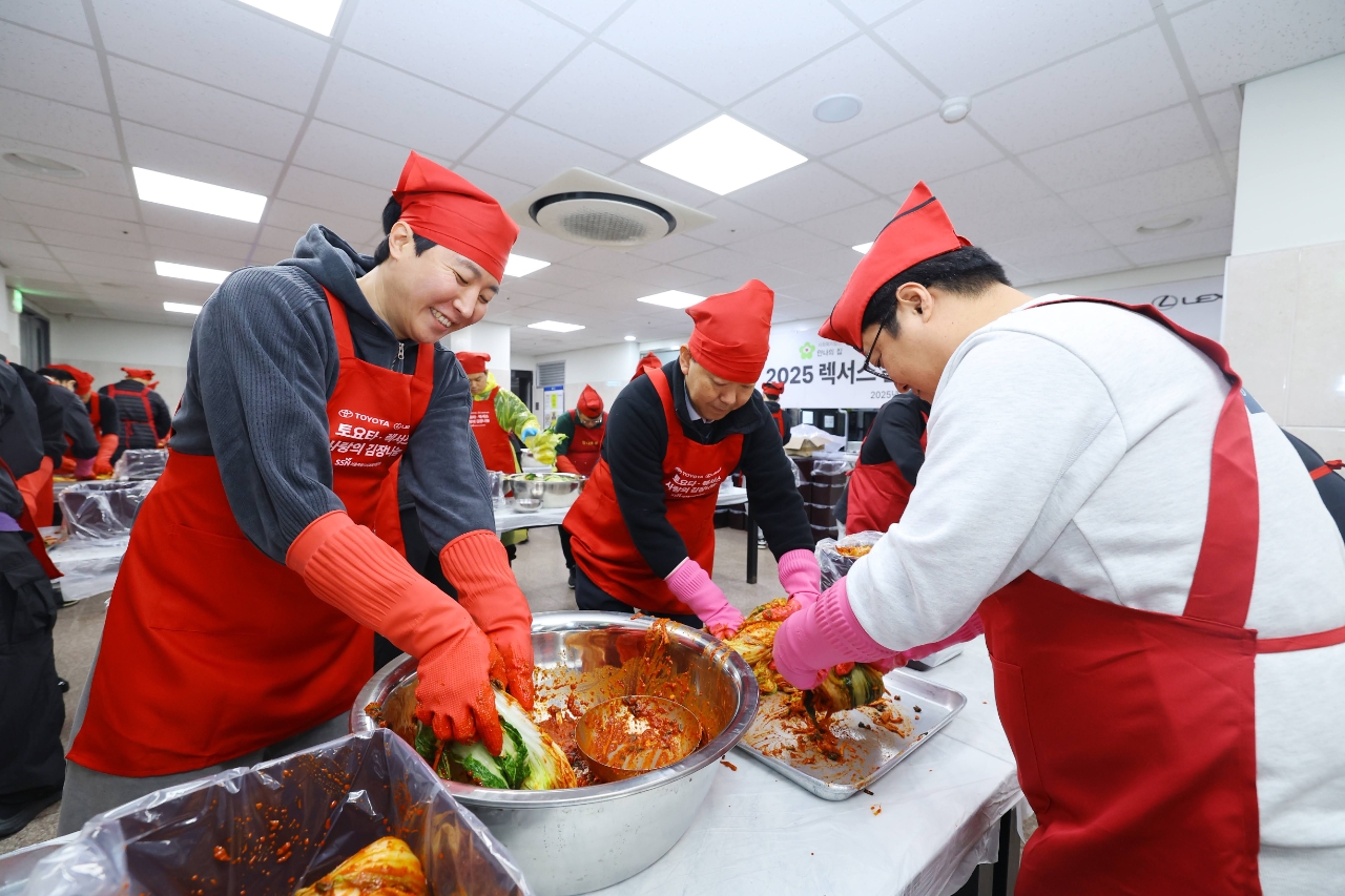 이날 경기도 성남시 중원구 '안나의 집' 봉사 현장에는 이른 아침부터 토요타 임직원들의 열기가 가득했다. 참가자들은 고무장갑을 끼고 능숙하게 배추 속을 채우며, 마치 '가족의 식탁'에 올릴 김치를 준비하듯 정성을 쏟았다. 각 지역 딜러 대표와 임직원들이 '원팀'이 되어 김치 한 포기 한 포기에 따뜻한 마음을 담아냈다.