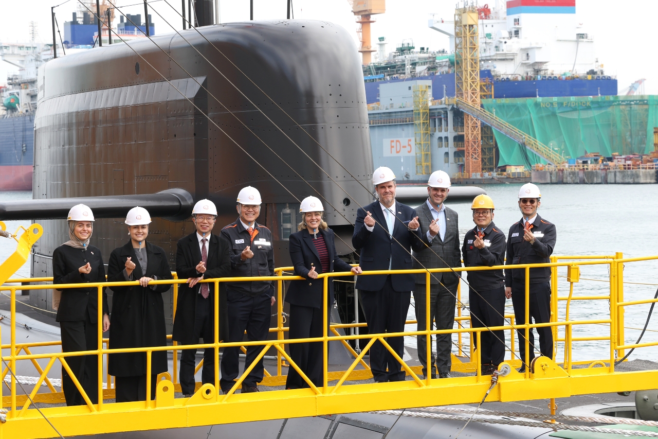 24일 멜라니 졸리 캐나다 산업부 장관(가운데)이 김희철 한화오션 대표이사(왼쪽에서 네 번째), 강환석 방위사업청 차장(왼쪽에서 세 번째) 등과 함께 한화오션이 건조한 잠수함인 장영실함을 배경으로 단체사진을 찍고 있다. 사진=한화오션