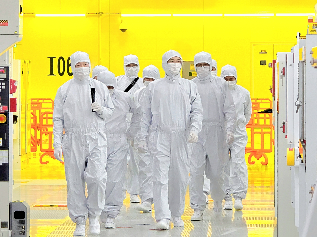 이재용 삼성전자 회장(앞줄 가운데)이 22일 삼성전자 기흥캠퍼스 내 첨단 복합 반도체 연구개발(R&D) 센터인 NRD-K 클린룸 시설을 살펴보고 있다. 사진=삼성전자