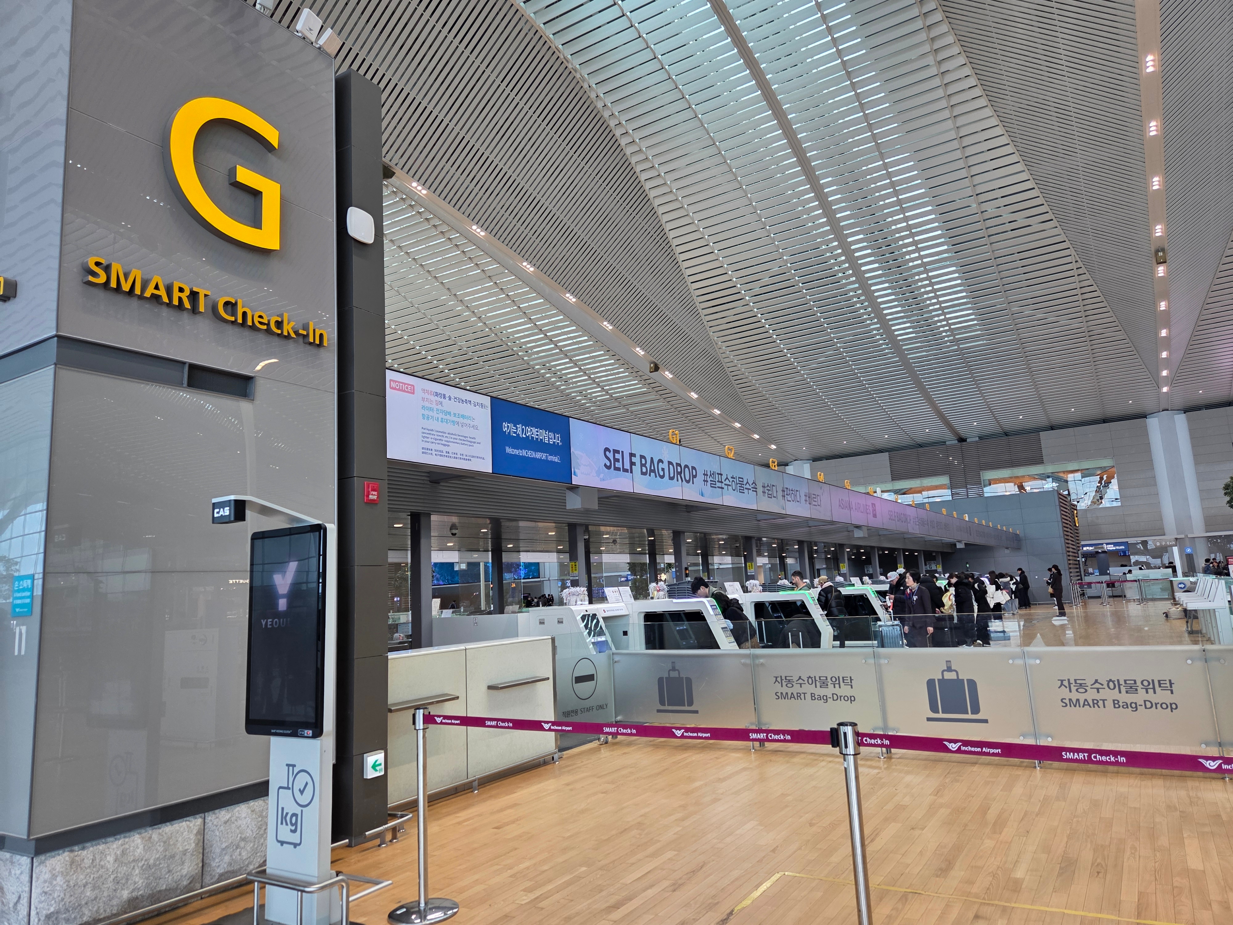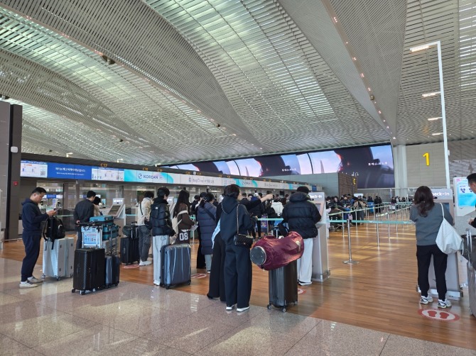 이날 오전 제2터미널 3층 동편 G~J열 체크인 구역에서는 아시아나항공 직원들이 승객들을 안내하고 있었다. 셀프 체크인 키오스크에는 줄이 거의 없었고 탑승권을 지참한 승객들이 직원의 도움을 받아 수속을 진행하는 카운터에만 소규모 대기 줄이 형성됐다. 대한항공 키오스크 주변에는 직원들이 다수 배치돼 있었다. 아시아나항공 역시 직원들이 승객 곁에서 수속 절차를 돕는 모습이 이어졌다.