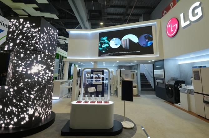 유리 파우더 형태인 퓨로텍은 플라스틱이나 페인트, 고무 등 자재를 만들 때 소량 첨가하면 미생물에 의한 악취, 오염 등을 막는 항균·항곰팡이 기능성 소재다. LG전자가 이 전시회에 참가하는 것은 이번이 처음이다.