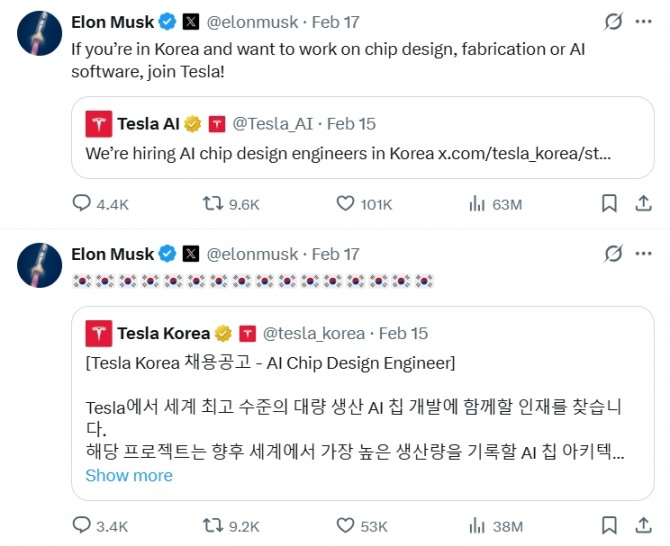 이미지 확대보기일론 머스크는 지난 17일(현지 시각) 자신의 X(옛 트위터)에 테슬라코리아의 인공지능(AI) 칩 디자인 엔지니어 채용 공고를 공유했다. 16개의 태극기 이모티콘도 함께였다. "만약 당신이 한국에 있고 칩 디자인, 제조, AI 소프트웨어 분야에서 일하고 싶다면 테슬라에 지원하라"고 썼다.