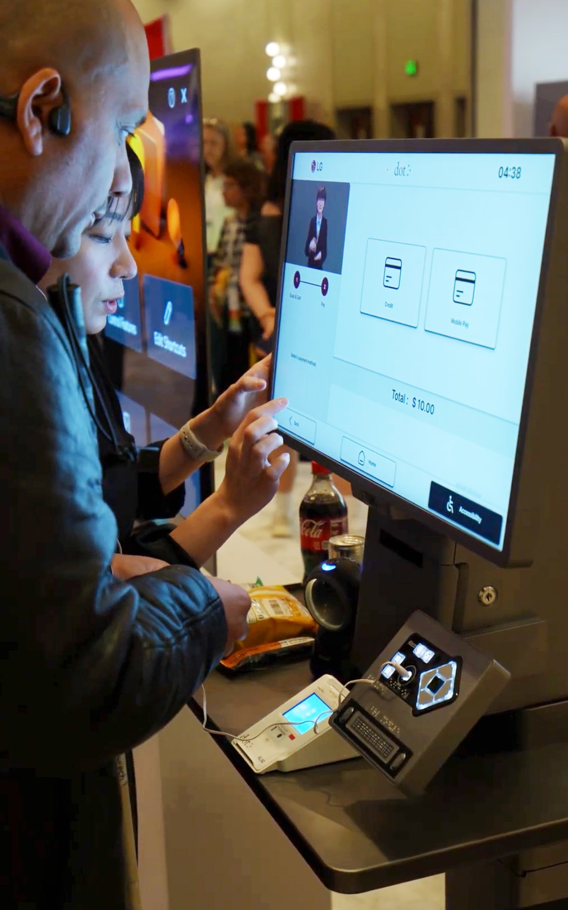 LG전자는 단독 전시부스를 마련하고 장애인, 시니어 고객의 접근성을 높이는 제품과 서비스를 관람객들이 직접 체험해 볼 수 있도록 했다. 올해 전시에는 점자기기 전문기업 닷(Dot)과 공동 개발한 키오스크 신제품을 처음으로 선보였다. 장애 고객들도 편리하게 사용할 수 있도록 점자패널·수어안내·스크린리더 등 다양한 접근성 기술을 통합 적용한 제품이다. 휠체어 사용자나 키가 작은 고객은 버튼을 눌러 키오스크 스탠드의 높낮이를 조절할 수 있다.
