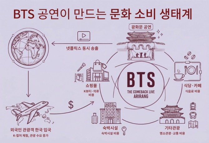 이는 단순 내수 업종에만 해당하는 것은 아니다. BTS 광화문 공연을 중심으로 △관광 유입 △소비 △콘텐츠 확산이 맞물리는 ‘문화 소비 생태계’가 형성되고 있다. 공연을 매개로 유입된 수요가 숙박·유통·관광 등으로 확산된 후 다시 콘텐츠 소비로 이어지는 순환 구조다.