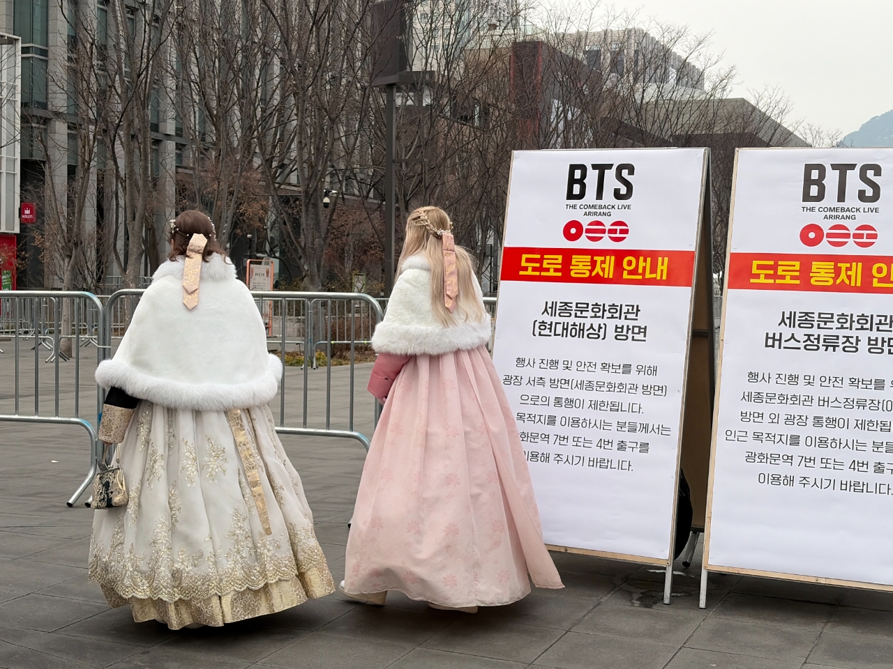 ‘BTS 컴백 라이브: ARIRANG’을 사흘 앞둔 18일 오전 서울 광화문 일대는 온통 BTS 광고판과 안내판으로 덮여 있었다. 세종문화회관 계단에는 넷플릭스 생중계 광고가 부착돼 시민들의 발걸음을 멈추게 했다. 일부 시내버스에도 관련 광고가 등장하며 도심 전반이 공연 분위기로 채워지고 있다.