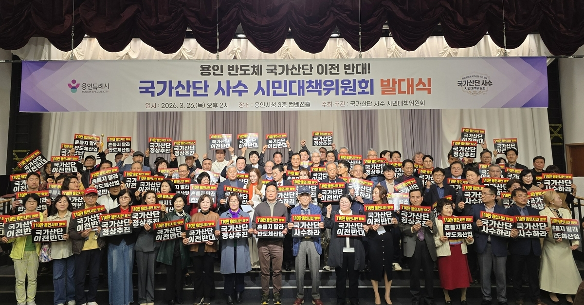용인지역 20여개 시민단체와 자발적 참여 시민들로 구성된 '용인 반도체 국가산단 사수 시민대책위원회(대책위)'는 26일 경기 용인시청 컨벤션홀에서 공식 발대식을 열고 원안 사수를 위한 활동에 돌입했다.