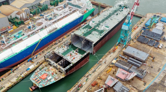 선미부, 울산 조선소에서 직접 제작…선수부, 통영 HSG 성동조선에서 제작해 결합
