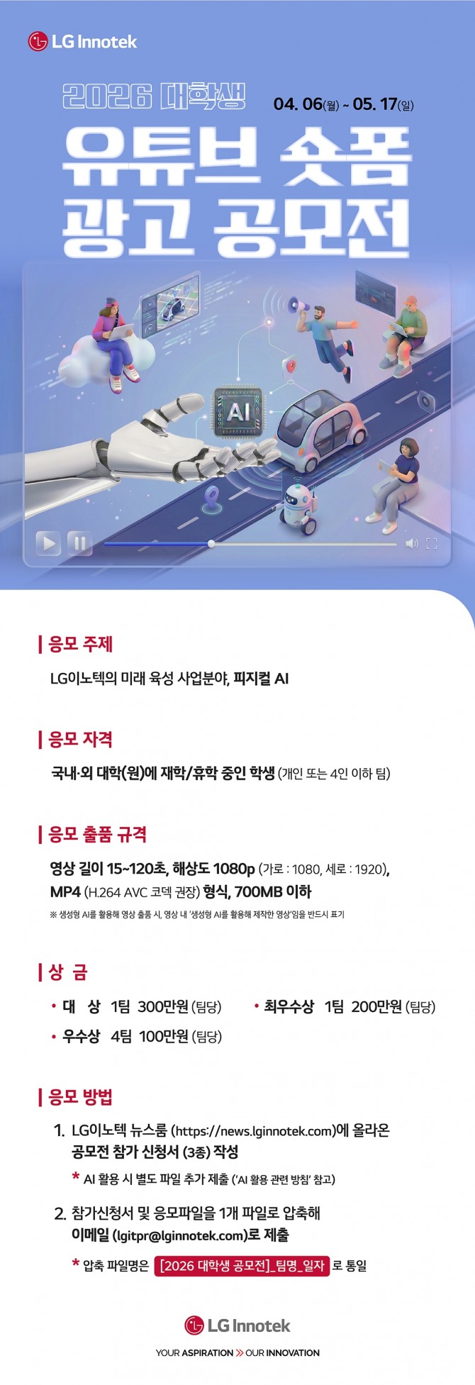 공모전은 국내·외 대학교(원)에 재학 또는 휴학 중인 학생이라면 누구나 참여 가능하다. 개인 또는 4인 이하의 팀으로 출전할 수 있다. 접수 기간은 5월 17일까지로 응모 희망자는 LG이노텍 뉴스룸에 게시된 참가 신청서를 작성한 뒤 출품 영상과 함께 이메일로 제출하면 된다.