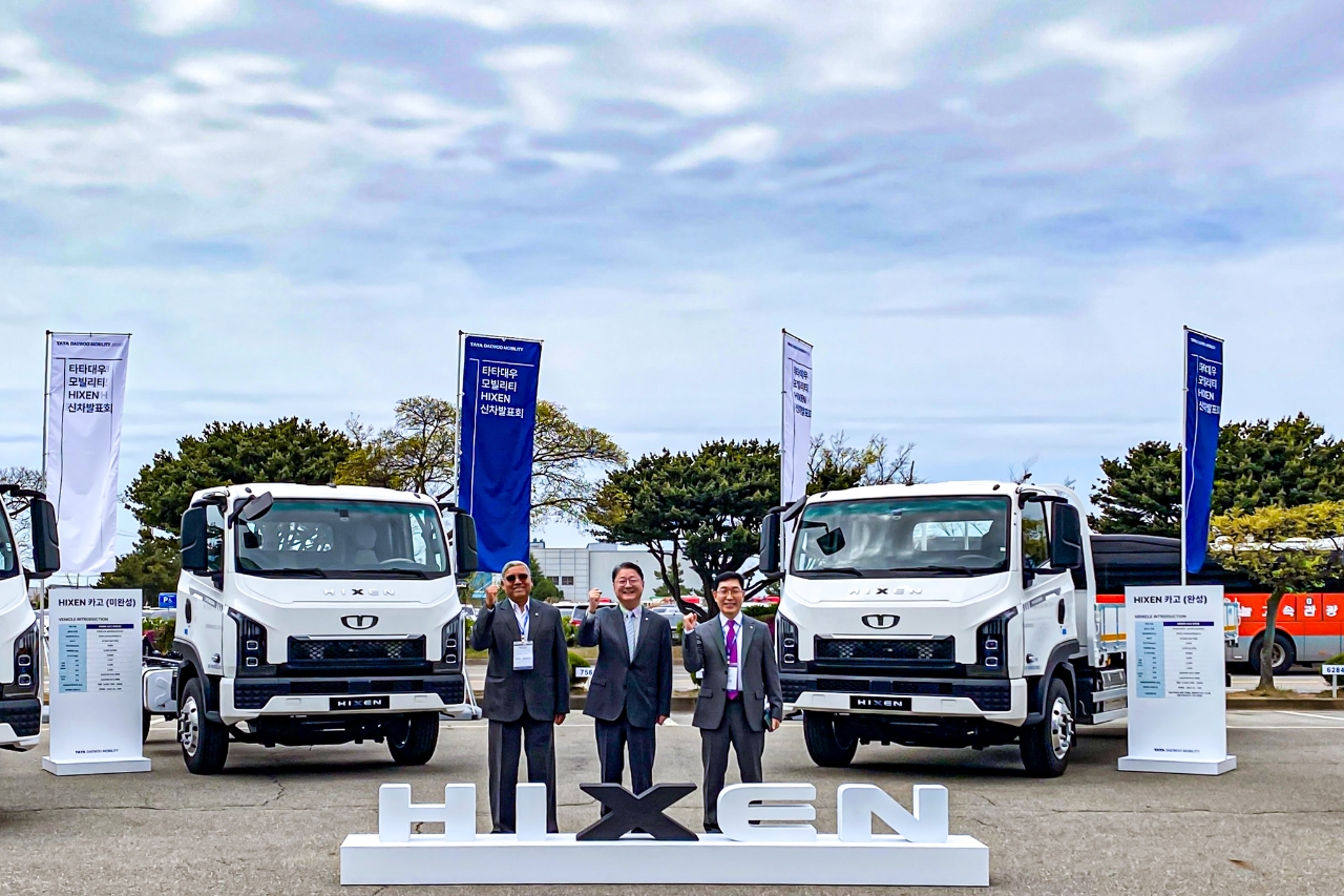 타타대우모빌리티 하이쎈(HIXEN)출시 기념 미디어데이에서 (좌측부터) 타타대우모빌리티 아닐 신하(Anil Sinha)부사장, 김태성 사장, 황춘화 연구소장이 기념사진 촬영을 하고 있다. 사진=박지수 기자