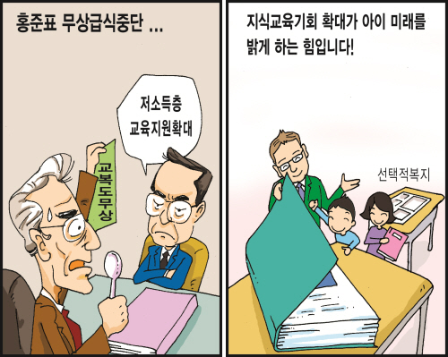 우승용의 태클맨TACKLE Man 만평14-무상급식 중단과 자녀교육 기회 확대