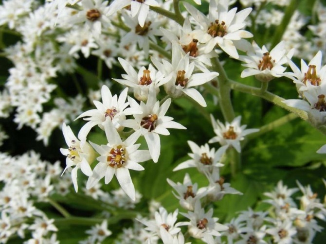 돌단풍은 봄 햇살이 점차 따뜻해지면 먼저 잎을 피우고 어느 날 불쑥 단풍잎 닮은 이파리 사이로 꽃대를 쓰윽 밀어 올린다. 한 뼘에서 기껏해야 한 자를 넘지 않는 아담한 키의 잎이 없는 꽃대 끝에 작은 별 같은 흰 꽃들이 모여 원뿔 모양의 꽃차례를 이루며 우리의 눈길을 잡아끈다.