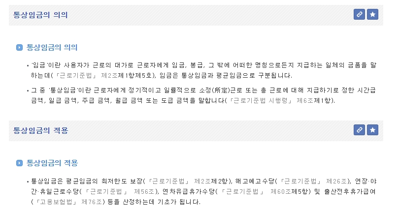 통상임금이란 근로자에게 정기적, 일률적, 고정적으로 소정근로 또는 총 근로에 대하여 지급하기로 정하여진 시간급ㆍ일급ㆍ주급ㆍ월급 또는 도급금액을 말한다. 즉, 1근로시간 또는 1근로일에 대하여 지급하기로 노사계약에 명시한 통상적인 임금액을 말한다. 통상임금은 해고예고수당, 시간 외ㆍ야간ㆍ휴일근로 시의 가산수당, 연차유급휴가수당, 퇴직금의 산출기초가 된다. 상여금 및 각종 수당의 경우 1988년 예규로 정한 통상임금 산정지침에 따라 통상임금에 포함되지 않았으나 이후 법원이 차츰 통상임금 범위를 확대해 오고 있다.