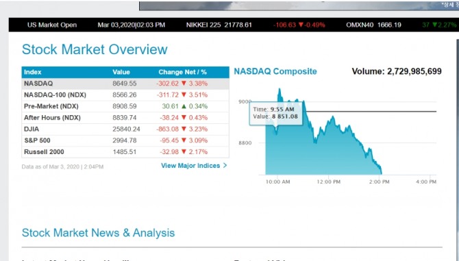 문제는 금리인하에도 불구하고 뉴욕증시가 급락하고 있다는 점이다. 다우지수는 1000포인트 나 떨어졌다. 코로나 사태로인한 경제 불안이 심상치 않다.