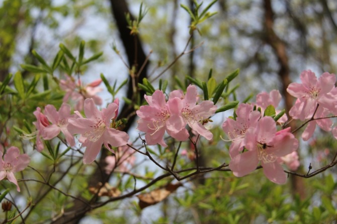 멀리서 바라보면 몽실몽실 피어오르는 신록이 마치 숲 전체가 꿈을 꾸는 듯하다. 그 연둣빛을 가까이에서 보려고 숲을 찾았는데 제일 먼저 눈에 띈 것은 연분홍의 철쭉이다. 연두가 흐르는 숲의 허공을 점점홍으로 수를 놓고 있는 철쭉의 싱그러움이라니! 진달래가 지고 난 뒤 피어나는 철쭉은 꽃도 훨씬 크고 분홍색이 진달래보다 훨씬 연해서 싱그러운 봄을 한껏 느끼게 해준다. 다투어 피던 봄꽃들이 슬금슬금 뒷걸음치는 사이, 은밀하게 연둣빛 새 옷으로 갈아입고 있는 숲은 늙은 엄마의 품처럼 조금 쓸쓸하고 많이 따뜻하다.
