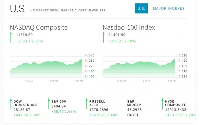 이미지 확대보기6일 뉴욕증시에 따르면 나스닥지수는 이 시각 현재 2.1% 다우지수는 1.6% 오른 상태에서 거래되고 있다. 뉴욕증시의 부활은 코스피 코스닥 환율 등에도 영향을 줄 것으로 보인다.