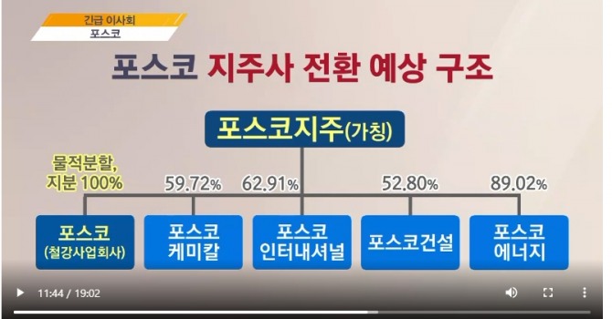 국영기업으로 출발한 포스코는 2000년 10월 민영화를 단행했다. 정부가 보유한 지분을 완전 매각한 이후 지금까지 분산된 지분구조를 유지했다. 9월 말현재 포스코 지분을 5% 이상 보유한 주주는 국민연금(9.75%)과 미국의 자산운용사 블랙록(5.23%) 뿐이다. 그외는 모두 기관 및 개인, 외국인 투자자들이다. 일반 주주들입장에서는 인적분할 대신 물적분할을 한 것에 아쉬수움이 있다. 지배주주가 없는 포스코의 지분구조를 고려하면 지주사와 자회사를 모두 상장하는 인적 분할 방식은 경영권 위협으로 부담이 컸을 것이라는 분석이 있다. 공정거래법에 따르면 내년부터 지주사는 상장 자회사 지분을 30% 이상 보유해야 한다. 포스코의 자사주 비중이 13% 여서 추가 지분 17%를 더 확보하기에는 재원 조달 등이 큰 부담이다. 물적 분할을 할 수 밖에 없었다는 것이다. 포스코측은 물적분할을해도 주주들에게 주가상승으로 3배의 이익이 돌아 갈 수 있다고 장담하고 있다.