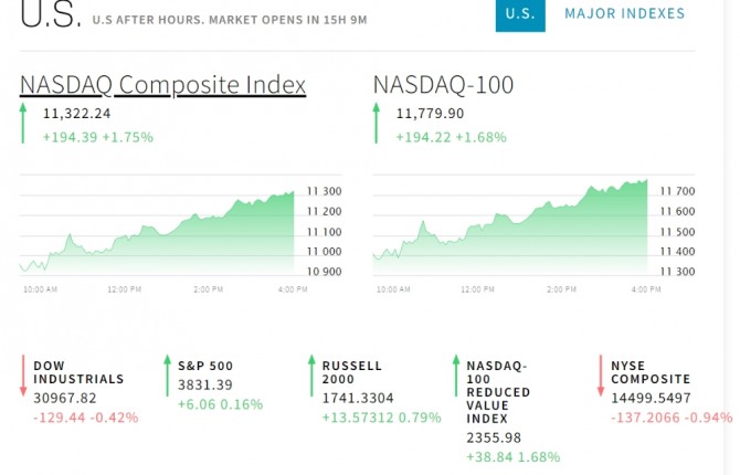 스탠더드앤드푸어스(S&P)500지수는 전장보다 6.06포인트(0.16%) 오른 3,831.39로 마감했다. 기술주 중심의 나스닥 지수는 전장보다 194.39포인트(1.75%) 뛴 11,322.24로 장을 마쳤다. S&P500지수는 장 초반 2% 이상 하락했다가 강보합세로 장을 마쳤고, 나스닥지수도 장 초반 2% 가까이 하락했다가 1% 이상 반등했다.
