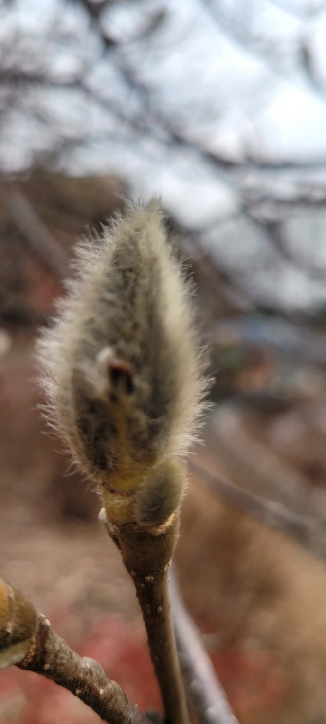 이미지 확대보기산책을 하며 내가 유심히 살피는 것은 나무들이다. 혹한의 겨울을 견딘 나무들이 보란 듯이 자랑처럼 펼칠 연둣빛 세상은 상상하는 것만으로도 충분히 나를 설레게 한다. 그중에도 단연 나의 눈길을 사로잡는 것은 목련이다. 목련은 지구상에 가장 먼저 모습을 드러낸 꽃식물 중 하나로 이른 봄 잎이 나기 전에 먼저 꽃을 피우는 대표적인 선화후엽(先花後葉)의 식물이다. 목련꽃의 특징 중 하나는 꽃받침과 꽃잎이 뚜렷하게 구분되지 않는다는 점이다. 꽃이 진 후 여름과 가을에 걸쳐 다음 봄을 위해 겨울눈을 만드는데 꽃받침이 따로 없는 꽃눈은 낙엽성 포엽에 의해 보호된다. 목련꽃 포엽은 비단결 같은 털이 빼곡히 들어차서 꽃눈을 혹한의 추위로부터 완벽하게 보호해주는 방한복 역할을 한다. 볕 좋은 날 오후, 은회색의 털로 덮인 목련의 겨울눈을 보고 있으면 금세라도 꽃망울이 벙글 것 같은 착각이 일기도 한다.