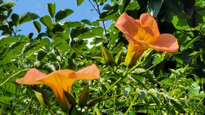 중국 원산의 능소화지만 오래전부터 심고 가꾸어 우리 꽃이나 다름없는 꽃이다. 담장이나 벽을 타고 올라가는 능소화가 대부분이지만 고목을 타고 올라가며 핀 능소화는 바라보는 것만으로도 황홀하다. 능소화도 여러 종류가 있다. 예로부터 심고 가꿔온 능소화는 꽃이 등황색이고 꽃받침은 연두색이며 꽃도 균형이 잡혀 아름답다. 반면 미국능소화는 꽃통이 훨씬 길쭉하고, 꽃이 진한 붉은색이고 꽃받침도 붉은색이다. 가지 끝에 꽃이 모여 달린다. 그런가 하면 능소화와 미국능소화의 교잡종인 마담갈렌능소화는 꽃은 붉은색이고 꽃받침은 노란색에 가깝다. 혹자는 다양한 능소화를 두고 미적 우열을 따지기도 하지만 굳이 그래야 할 이유는 없지 싶다.