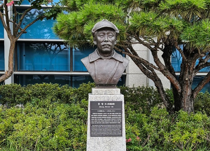 이미지 확대보기국방부가 육군사관학교 내에 설치된 고(故) 홍범도 장군 흉상을 포함한 국방부 청사 앞에 설치된 흉상도 필요시 이전을 검토하고 있다고 밝혔다. 사진은 지난 28일 서울 용산구 국방부 청사 앞에 설치된 고(故) 홍범도 장군 흉상 모습. 사진=뉴시스