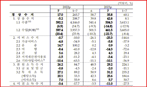수입(461억5천만달러)은 22.7%(135억9천만달러) 줄었는데, 감소액이나 감소율이 모두 수출을 크게 웃돌았다. 에너지 수입 가격 하락으로 원자재 수입이 작년 같은 달보다 35.7% 급감했다. 원자재 중 가스, 석탄, 원유, 석유제품 수입액 감소율은 각 51.2%, 46.3%, 45.8%, 40.9%에 이른다. 반도체(-22.6%)와 반도체 제조장비(-13.7%), 수송장비(-13.3%) 등 자본재 수입도 12.5% 줄었고, 곡물(-20.3%)과 승용차(-19.2%) 등 소비재 수입 역시 12.1% 축소됐다. 서비스수지는 25억3천만달러 적자를 기록했다. 6월(-26억1천만달러)보다는 적자가 소폭 줄었지만, 지난해 같은 달(-7천만달러)과 비교하면 적자 규모가 약 36배로 커졌다. 코로나19 관련 방역이 완화되면서 여행수지(-14억3천만달러) 적자 폭이 1년 전(-8억4천만달러)의 거의 두 배에 이르렀고, 운송수지 흑자(9천만달러)는 작년 같은 달(14억7천만달러)보다 13억달러 이상 급감했다.