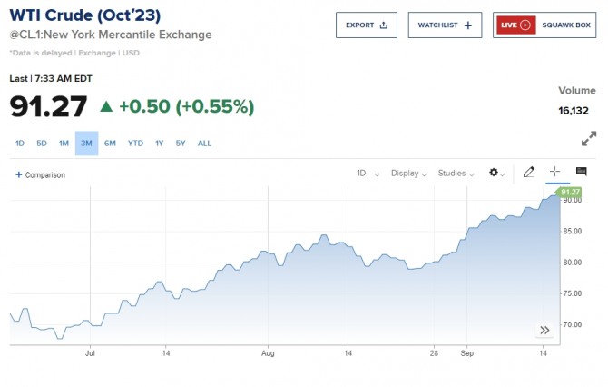 19일 뉴욕증시와 상품거래소에 따르면 WTI는 이시각햔쟈 배럴당 91달러 선에 진입해있다. 뉴욕증시에서는 유가 강세가 이어지며 국제유가가 연내 배럴당 100달러에 이를 것이란 전망이 늘고 있다.런던 ICE선물거래소에서 브렌트유 선물도 연일 오르고 있다. 미국 뉴욕증시 투자은행인 뱅크오브아메리카(BoA)의 상품·파생상품 리서치 책임자인 프란시스코 블랜치는 보고서에서 "OPEC 플러스(+)가 아시아의 긍정적인 수요 배경을 토대로 연말까지 지속해 공급 감축을 유지할 경우 2024년 이전에 브렌트유 가격이 배럴당 100달러를 넘어설 것으로 생각한다"라고 내다봤다. JP모건의 에너지전략 글로벌 책임자인 크리스티안 말렉도 국제유가가 장기적으로는 배럴당 80달러선을 유지하겠지만 단기적으로는 배럴당 80∼100달러선에서 거래될 것이라고 예상했다.