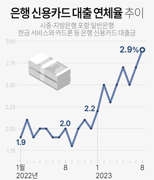 한국은행 통계를 보면 8월 말 기준 은행권 신용카드 대출금 연체율은 2.9%다. 1년 전의 2.0%였던 게 1년 만에 0.9%p 상승한 수치다. 2015년 8월의 3.1% 이후 8년 만의 최고 수준이다. 8월 기준 은행의 가계대출 연체율도 4년 만의 최고치다.