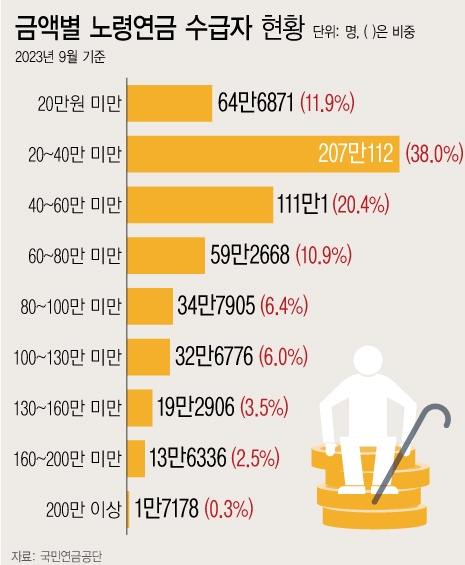 노후 급여인 소득대체율을 낮추기는 힘들다. 40년 가입 기준 소득대체율은 40%다. 60세 정년을 고려하면 40년을 채우는 사람은 드물다. 실질 소득대체율은 20%대 후반이다.