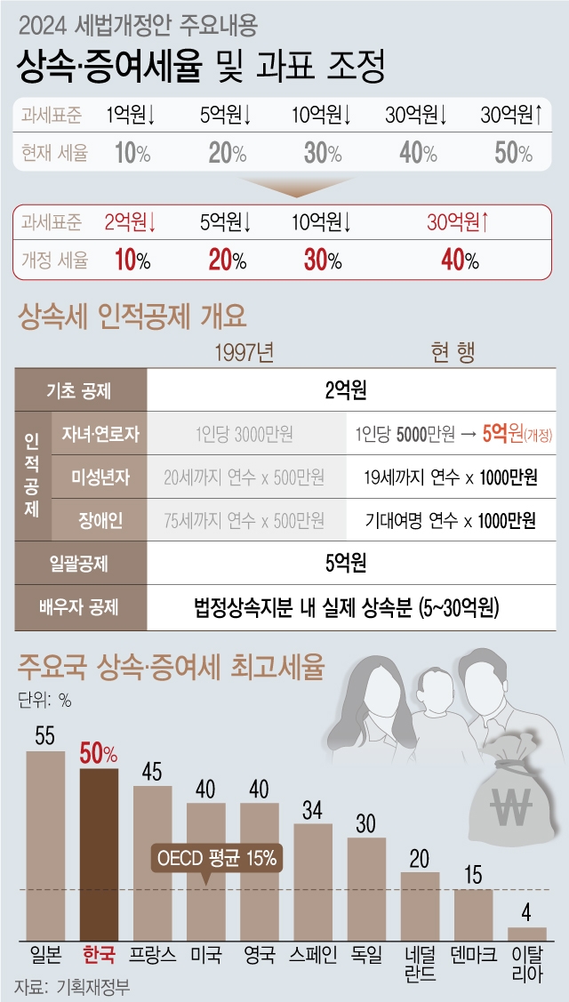 핵심은 25년 만의 상속세 개편이다. 사실상 중산층 세금으로 변화한 점을 고려해 최고세율을 50%에서 40%로 인하하기로 한 것이다.