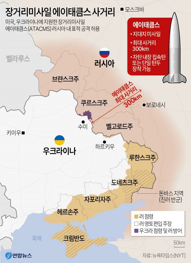 미국산 에이태킴스 미사일은 사거리 300㎞인 러시아 본토 타격용 무기다. 러시아가 북한군을 우크라이나 전선에 본격 투입하자 미국이 대응조치를 취한 것이다.
