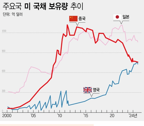 이미지 확대보기1년 만에 570억 달러나 줄어들었다. 미 국채 매각은 36조 달러의 정부 부채를 가진 미국 경제에 치명적이다. 미 정부가 재원 조달을 위해 국채를 추가로 발행하기 힘들어지기 때문이다.