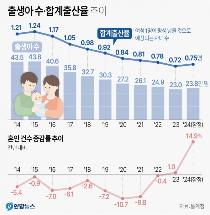 여성 1명이 평생 낳을 것으로 예상되는 평균 출생아 수인 합계출산율도 0.75명으로 0.03명 늘었다. 출생아 수와 합계출산율이 늘어나기는 2015년 이후 9년 만이다.