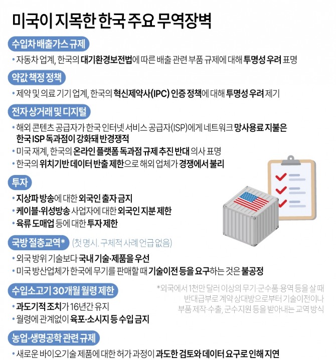 외국 재보험사나 로펌의 한국 시장 진출 시 정부의 규제 등 비관세 장벽도 시정을 요구 중이다. 미국 자동차 수입을 제한하는 배출가스 부품 규제도 불만이다.