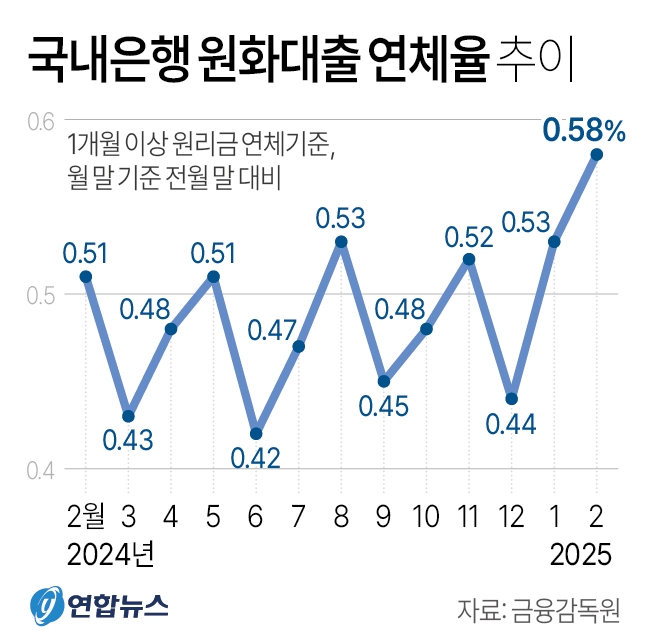 부문별로는 중소기업과 개인사업자 연체율이 각각 0.84%와 0.76%로 높다. 특히 중소기업 연체율은 지난해 2월 0.47%에서 2배가량 늘어난 수치다. 대기업 연체율이 상대적으로 높았던 2018년과 대조적이다. 가계대출 연체율은 0.43%로 비교적 안정적인 흐름이다.