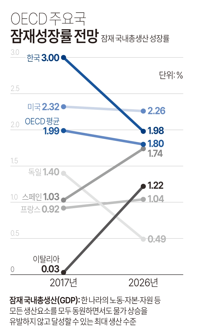 잠재성장률은 노동과 자본 등을 최대한 투입해 물가를 자극하지 않고 달성할 수 있는 최대 성장률이다. 우리 경제의 기초 체력이 갈수록 허약해지고 있음을 의미한다. 한국의 GDP는 세계 12위이고 시가총액(14위)도 상위권이지만 기업 가치로 보면 하위권이다.