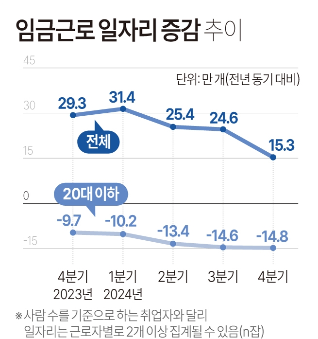 보건과 사회복지 서비스 분야의 일자리는 늘었다. 정부가 정책 지원으로 늘린 공공 일자리와 단기 임시직 비중이 늘어난 여파다. 이게 지난해 4분기 전체 신규 일자리를 2090만2000개로 1년 전보다 15만3000개 늘어나게 만든 일등 공신 격이다.
