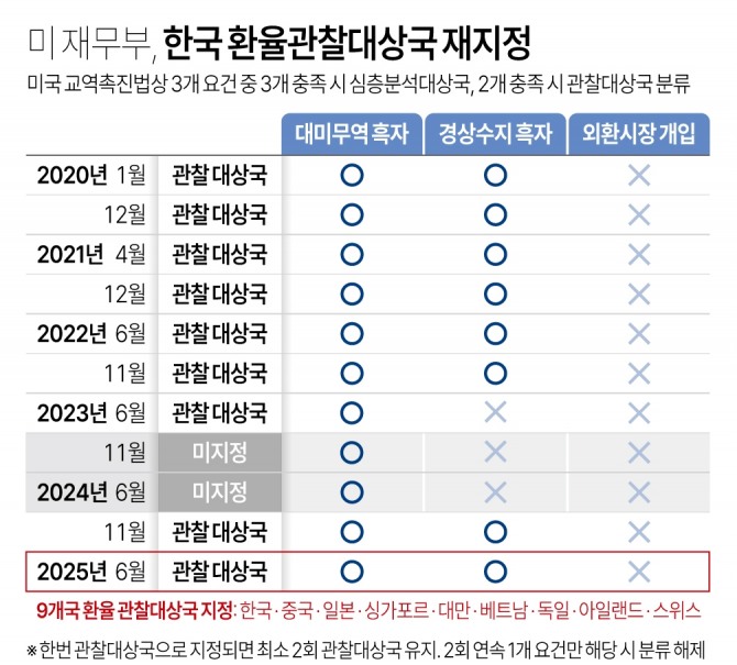 미 재무부의 환율관찰대상국 지정 기준은 상품과 서비스 등 150억 달러 이상의 대미 무역 흑자국과 국내총생산(GDP)의 3%를 초과하는 경상수지 흑자국 그리고 12개월 중 8개월간 GDP의 2%를 초과하는 달러 순매수 여부다.